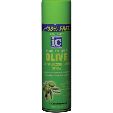 Olive Sheen Spray / 14 oz. Non-oily moisturizer that protects hair from heat and chemical damage. Repairs, strengthens and shines dry and damaged hair. Hydrates, conditions, nourishes hair leaving it with a healthy, soft shine. 14 oz.