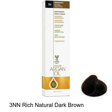 One 'N Only Argan Oil Permanent Cream Color - 3NN Rich Natural Dark Brown / 3 oz. One 'n Only™ Argan Oil Permanent Color cream is a hair color breakthrough! Advanced micro pignments combine with precious argan oil for luminous color, rich gray coverage, brilliant shine, and unmatched conditioning. Argan oil penetrates deep into the hair shaft to nourish, repair and lock in moisture, instantly smoothing the cuticle and improving elasticity. The low-ammonia formula provides deep color penetration and longer-lasting, consistent results.