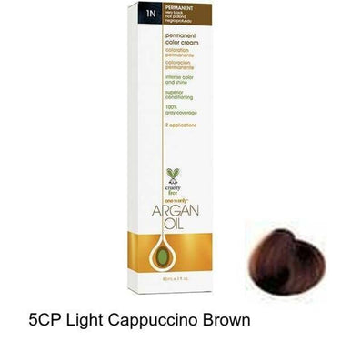 One 'N Only Argan Oil Permanent Cream Color - 5CP Light Cappuccino Brown / 3 oz. One 'n Only™ Argan Oil Permanent Color cream is a hair color breakthrough! Advanced micro pignments combine with precious argan oil for luminous color, rich gray coverage, brilliant shine, and unmatched conditioning. Argan oil penetrates deep into the hair shaft to nourish, repair and lock in moisture, instantly smoothing the cuticle and improving elasticity. The low-ammonia formula provides deep color penetration and longer-lasting, consistent results.