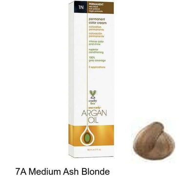 One 'N Only Argan Oil Permanent Cream Color - 7A Medium Ash Blonde / 3 oz. One 'n Only™ Argan Oil Permanent Color cream is a hair color breakthrough! Advanced micro pignments combine with precious argan oil for luminous color, rich gray coverage, brilliant shine, and unmatched conditioning. Argan oil penetrates deep into the hair shaft to nourish, repair and lock in moisture, instantly smoothing the cuticle and improving elasticity. The low-ammonia formula provides deep color penetration and longer-lasting, consistent results.