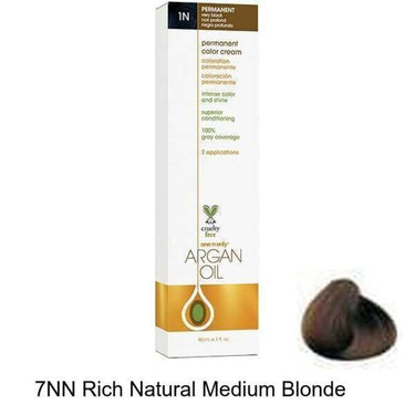 One 'N Only Argan Oil Permanent Cream Color - 7NN Rich Natural Medium Blonde / 3 oz. One 'n Only™ Argan Oil Permanent Color cream is a hair color breakthrough! Advanced micro pignments combine with precious argan oil for luminous color, rich gray coverage, brilliant shine, and unmatched conditioning. Argan oil penetrates deep into the hair shaft to nourish, repair and lock in moisture, instantly smoothing the cuticle and improving elasticity. The low-ammonia formula provides deep color penetration and longer-lasting, consistent results.