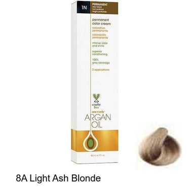 One 'N Only Argan Oil Permanent Cream Color - 8A Light Ash Blonde / 3 oz. One 'n Only™ Argan Oil Permanent Color cream is a hair color breakthrough! Advanced micro pignments combine with precious argan oil for luminous color, rich gray coverage, brilliant shine, and unmatched conditioning. Argan oil penetrates deep into the hair shaft to nourish, repair and lock in moisture, instantly smoothing the cuticle and improving elasticity. The low-ammonia formula provides deep color penetration and longer-lasting, consistent results.
