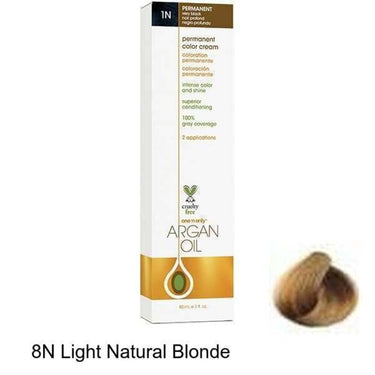 One 'N Only Argan Oil Permanent Cream Color - 8N Light Natural Blonde / 3 oz. One 'n Only™ Argan Oil Permanent Color cream is a hair color breakthrough! Advanced micro pignments combine with precious argan oil for luminous color, rich gray coverage, brilliant shine, and unmatched conditioning. Argan oil penetrates deep into the hair shaft to nourish, repair and lock in moisture, instantly smoothing the cuticle and improving elasticity. The low-ammonia formula provides deep color penetration and longer-lasting, consistent results.