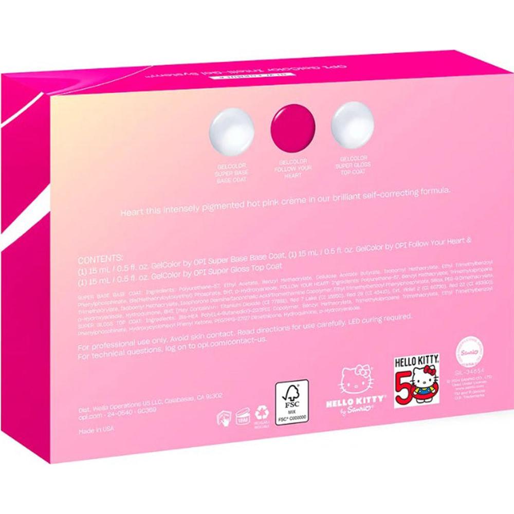 OPI GelColor OPI X Hello Kitty® Collection - Trio Pack. Transform your salon’s nail services with the OPI GelColor OPI X Hello Kitty® Collection - Trio Pack. This curated set is designed to offer everything needed for a flawless, long-lasting manicure, all while celebrating the iconic and playful spirit of Hello Kitty®. The trio includes the deep pink shade "Follow Your Heart," which is part of the limited edition OPI X Hello Kitty® Collection, along with OPI’s Super Base Base Coat and Super Gloss Top Coat. This trio is perfect for professionals who want to deliver high-quality, adorable, and durable manicures to their clients.