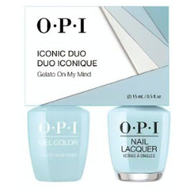 OPI Iconic Duo - GelColor + Nail Lacquer - SRJ65 (V33) - Gelato on My Mind / 0.5 oz. Each by OPI. OPI Iconic DUO - GelColor Soak-Off Gel Polish + Nail Lacquer. OPI consists of 100% pure gel formula, long lasting wear, divine protection, and optimal shine. The highly pigmented, advanced, gel formula is also solvent-free, which means no waste occurs from evaporation and you'll get more uses out of every bottle.