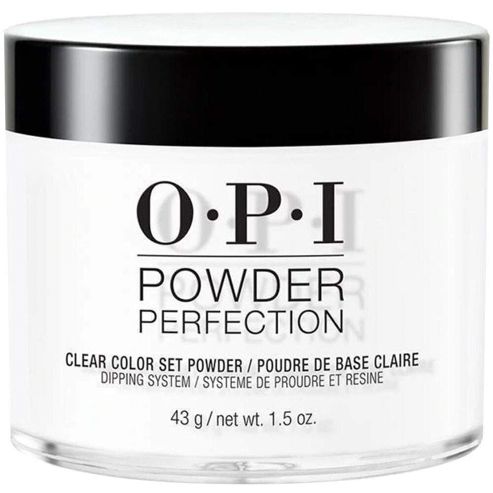 OPI Powder Perfection Clear Color Set Powder / 1.5 oz. Reinvent acrylic nails with an easy brush, dip, and tap application of OPI Powder Perfection. This new, quick applying, odor-free acrylic alternative promotes a clean-air environment while offering gel-like shine and weeks of wearwithout the need to light cure. OPI Clear Color Set Powder, used for French manicures, sets color powders during application for enhanced vibrancy. OPI Power Perfection delivers 2+ weeks of weightless, natural looking results. Bubble-free and non-yellowing. Non-damaging, soak-off wrap removal. After application of a resin in the form of a base coat, nail is dipped into a coloredacrylic powder multiple times, cured with an activator and finished with a top coat. Dries almost instantly, no need to light cure.