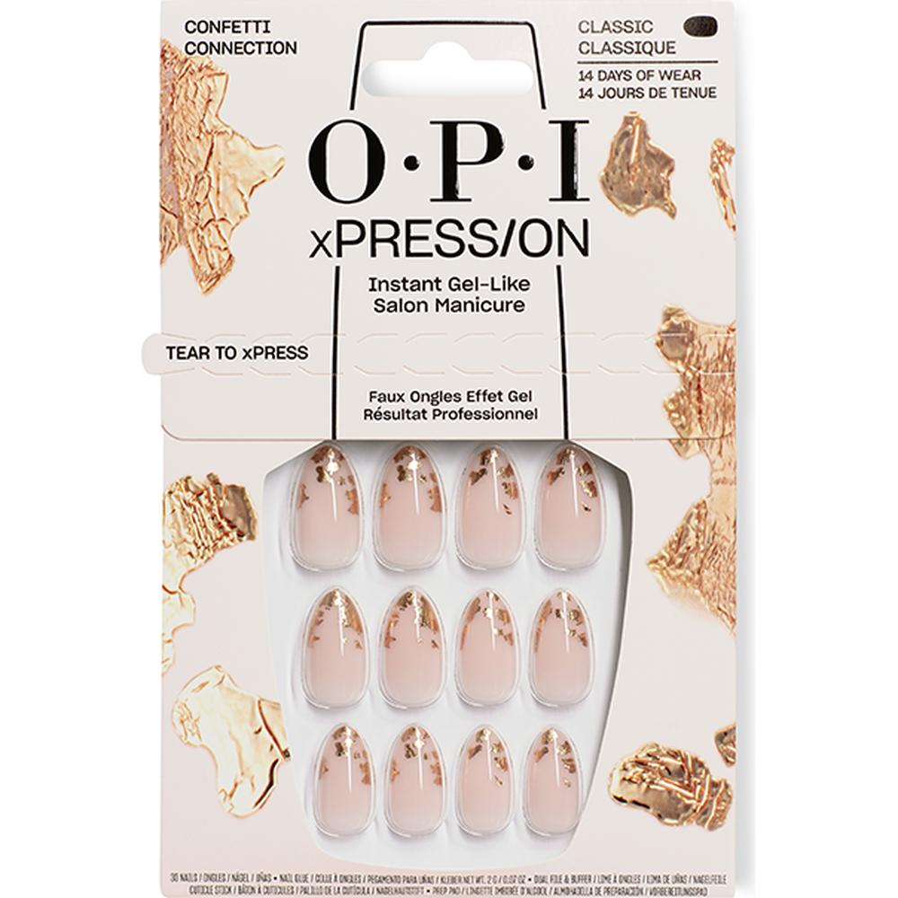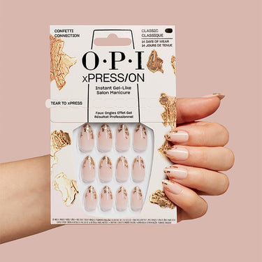 OPI xPRESS/ON Confetti Connection – At-Home Gel-Like Mani in Minutes. Create a polished, party-ready manicure on your own schedule—no UV lamp, no dry time, no salon appointment. OPI xPRESS/ON in Confetti Connection layers a soft nude base with subtle gold “confetti” flecks that look like hand-placed foil. The result is a classy, light-catching finish that’s easy to apply, comfortable to wear, and designed to last up to 14 days at home.