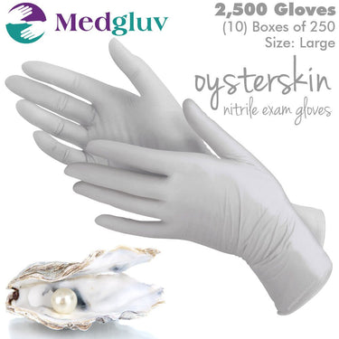 OysterSkin Nitrile Exam Gloves - Powder-Free Non-Sterile Grey Nitrile Exam Gloves / LARGE / 10 Boxes of 250 Gloves = 2,500 Gloves per Case by MedGluv. OysterSkin Nitrile Exam Gloves provide tactile sensitivity and protects hands from potentially infectious materials. New nitrile compounding technology allows for a thinner glove with incredible elasticity. They offer a soft and comfortable feel with outstanding tactile sensitivity. Packaged in 250 gloves per box (230 per box for XL). Devotes less space to glove storage, less time handling cartons.