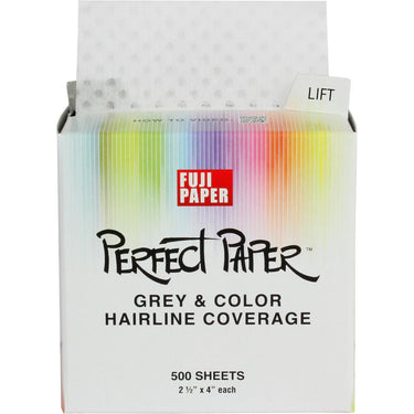 Perfect Paper - Grey & Color Hairline Coverage by Fuji. Enhance your color processing services with Perfect Paper by Fuji, specifically designed to provide 100% grey and color hairline coverage. Whether you're covering stubborn grey hair along the hairline or perfecting a color application, this breathable paper ensures precise, even results. Perfect Paper is a must-have tool for professional colorists who demand high-quality, reliable tools to improve client satisfaction and overall color performance. The breathable paper allows for optimal color oxidation while preventing color bleed, making it an essential addition to your salon's color station.