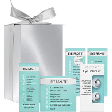 Pharmagel Holiday Complete Eye Regimen. Give tired eyes a visibly refreshed, well-rested look—fast. This curated, professional-grade eye collection pairs brightening Vitamin C care with targeted de-puffing, firming, and hydrating formulas, plus cooling stainless steel rollers for an instant spa sensation at home. Ideal for retail or as a results-driven add-on to your eye treatments, the set delivers a complete AM/PM protocol that helps soften the appearance of fine lines, dark circles, and puffiness while supporting long-term skin resilience.