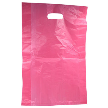Pink Plastic Bags for Retail Purchases / 100 Pack. This pink plastic bag features a die cut handle and is 12 X 3 X 18 with a thickness of 0.6 mm. You get 100 in a pack. Perfect for using in your salon to send your clients home with their retail purchases!
