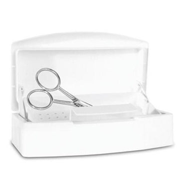 This white plastic sterilizer tray features a self-draining basket that rises when the lid is opened. When the lid is closed, the basket lowers to allow complete submersion of implements. Use to disinfect implements before each manicure, pedicure, haircut etc. Implements not included.