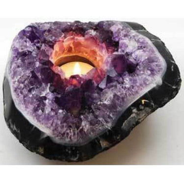 With an opening measuring approximately 1 1/2" in diameter, it can easily contain a small pillar candle or a tealight candle, which would leave the many facets of the amethyst crystal surrounding it glowing brightly with the warm light of the candle you place within it. Use it to decorate your home or place upon your altar to aid in candle magic and crystal healing, where it can help empower your psychic abilities and otherwise aid rituals and healing of the mind.