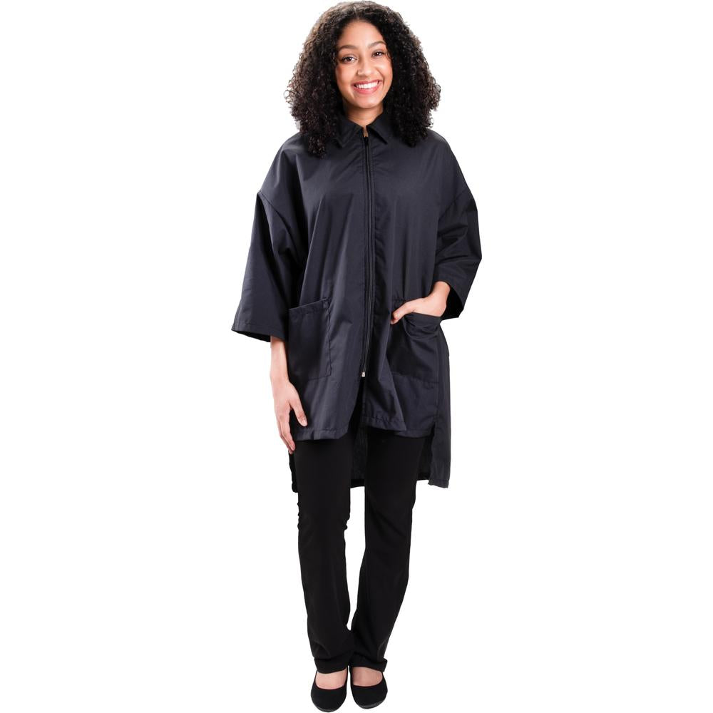 Why choose between functionality and fashion? The sleek, jet-black color projects a polished image, while the slightly oversized fit with-3/4-length sleeves adds a flattering and contemporary touch. Whether you're greeting a new client or finishing an intense color correction, you'll look poised, professional, and totally pulled together.