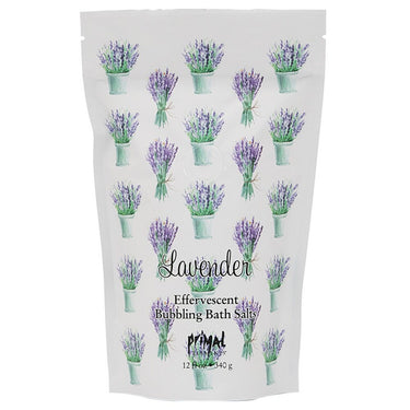Primal Elements Bubbling Bath Salt - LAVENDER / 12 oz. - 340 grams. Mineral rich salts from the sea and Himalayan pink salt to ease sore muscles, reduce tension and soften skin. Unique formula features an effervescent effect to fragrance the tub and environment. Coconut oil derived foamer is formulated for mildness. Completely portable with a handy zip top pouch. Made in the USA.
