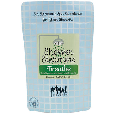 Primal Elements Shower Steamers - BREATHE / (2) 3 oz. Steamer Tablets - 2-3 Uses per Tablet / 6 oz. - 170 grams. Create a spa-like experience in your shower! Made with all natural ingredients and pure essential oils, shower steamers release aromas to enhance your mood and promote well being. 2 Shower Steamer tablets (3 oz. each). Approximately 3-4 uses per tablet.