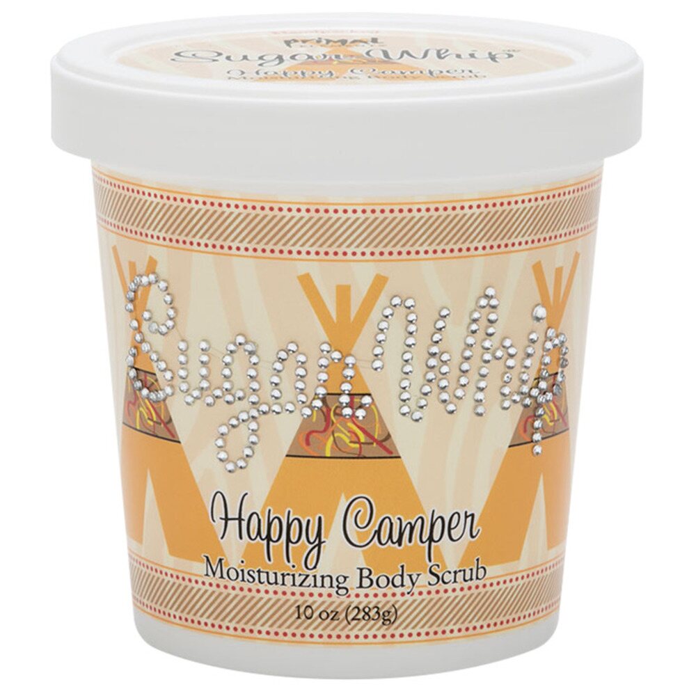 Primal Elements Sugar Whip - HAPPY CAMPER - Moisturizing Body Scrub / 10 oz. - 283 grams. The fragrant bouquet of fresh flowers and sweet sugar gently exfoliates to leave skin velvety smooth. This unique product is a triple threat as a cleanser, scrub, and moisturizer all in one convenient package. The sweet creamy lather rinses cleanly away, revealing softer, velvety smooth skin. Mild enough for everyday use. 10 oz. (283g)