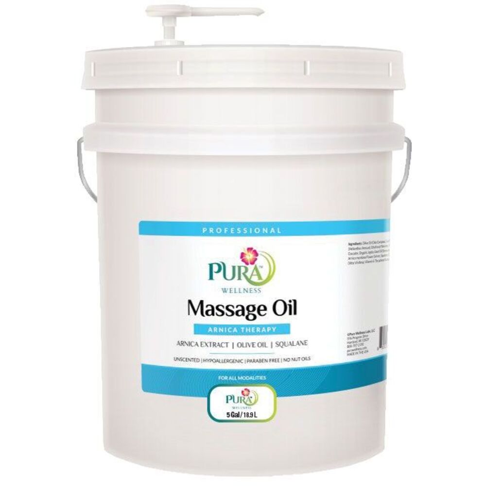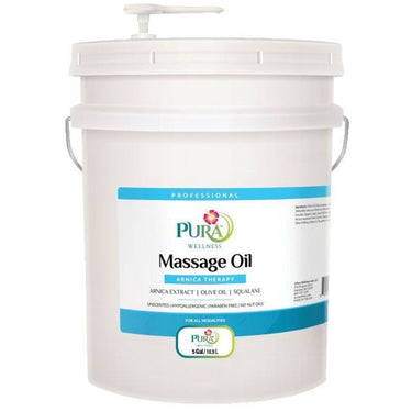 Pura Wellness Arnica Therapy Massage Oil / 5 Gallons - 18.9 Liters. Pura Wellness™ Arnica Therapy Massage Oil. This luxurious Arnica Massage Oil is naturally enriched with Arnica Extract, Olive Oil, and Squalane known for its superior skin moisturizing properties making it the healthy choice for professional massage. Formulated to offer therapists a finely textured satiny glide that is easily absorbed leaving the skin feeling soft and smooth. Completely water dispersible for easy cleanup of linens and fabrics. For all modalities.