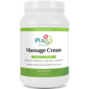 Pura Wellness Herbal Therapy Massage Cream / 1 Gallon - 128 oz. - 3.78 Liters. Pura Wellness Herbal Therapy Massage Cream. This smooth rich Herbal Massage Cream is naturally infused with Arnica & Ivy Extracts, Aloe Vera, and Chamomile known for its exceptional quality for the skin, making it the healthy choice for professional massage. Formulated to offer therapists a lasting glide and superb grip; less glide than an oil or gel yet wont absorb as fast as a lotion. For all modalities.