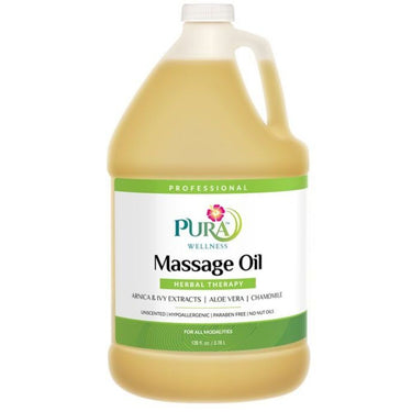 Pura Wellness Herbal Therapy Massage Oil / 1 Gallon - 128 oz. - 3.78 Liters. Pura Wellness™ Herbal Therapy Massage Oil. This smooth rich Herbal Massage Oil is naturally infused with Arnica & Ivy Extracts, Aloe Vera, and Chamomile known for its exceptional quality for the skin, making it the healthy choice for professional massage. Formulated to offer therapists a finely textured satiny glide that is easily absorbed leaving the skin feeling soft and smooth. Completely water dispersible for easy cleanup of linens and fabrics. For all modalities.