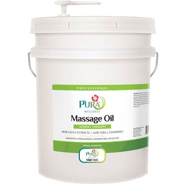 Pura Wellness Herbal Therapy Massage Oil / 5 Gallons - 18.9 Liters. Pura Wellness™ Herbal Therapy Massage Oil. This smooth rich Herbal Massage Oil is naturally infused with Arnica & Ivy Extracts, Aloe Vera, and Chamomile known for its exceptional quality for the skin, making it the healthy choice for professional massage. Formulated to offer therapists a finely textured satiny glide that is easily absorbed leaving the skin feeling soft and smooth. Completely water dispersible for easy cleanup of linens and fabrics. For all modalities.