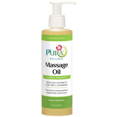 Pura Wellness Herbal Therapy Massage Oil / 8 oz. - 237 mL. Pura Wellness™ Herbal Therapy Massage Oil. This smooth rich Herbal Massage Oil is naturally infused with Arnica & Ivy Extracts, Aloe Vera, and Chamomile known for its exceptional quality for the skin, making it the healthy choice for professional massage. Formulated to offer therapists a finely textured satiny glide that is easily absorbed leaving the skin feeling soft and smooth. Completely water dispersible for easy cleanup of linens and fabrics. For all modalities.