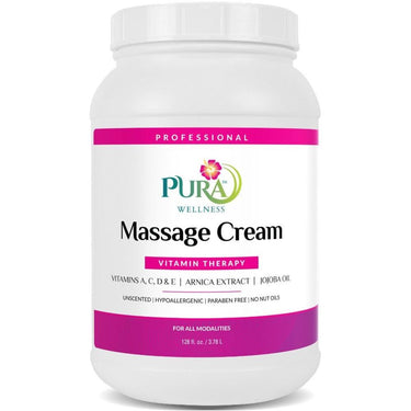 Pura Wellness Vitamin Therapy Massage Cream / 1 Gallon - 128 oz. - 3.78 Liters. Pura Wellness™ Vitamin Therapy Massage Cream. This advanced Vitamin Massage Cream is enriched with Vitamins A, C, D & E, Arnica Extract, and Jojoba Oil known for its exceptional quality for the skin making it the healthy choice for professional massage. Formulated to offer therapists a lasting glide and superb grip; less glide than an oil or gel yet wont absorb as fast as a lotion. For all modalities.