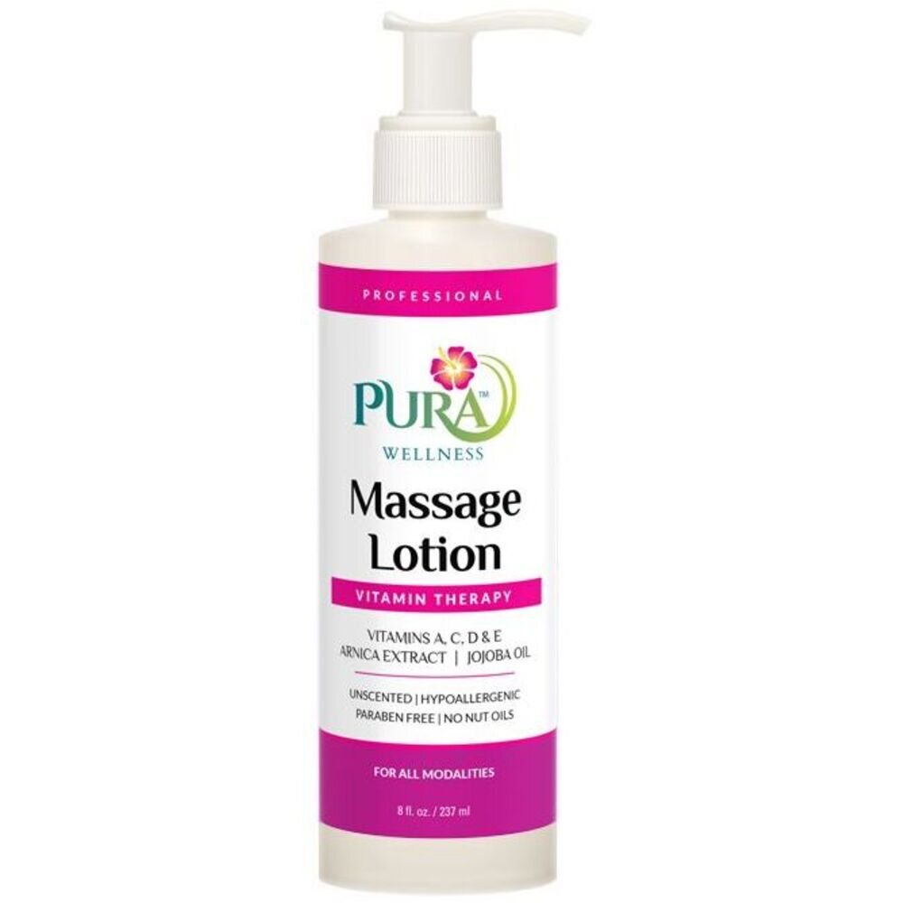 Pura Wellness Vitamin Therapy Massage Lotion / 8 oz. - 237 mL. Pura Wellness™ Vitamin Therapy Massage Lotion. This advanced Vitamin Massage Lotion is enriched with Vitamins A, C, D & E, Arnica Extract, and Jojoba Oil known for its exceptional quality for the skin making it the healthy choice for professional massage. Formulated to offer therapists a lasting glide with a lighter touch, requiring less reapplications. For all modalities.