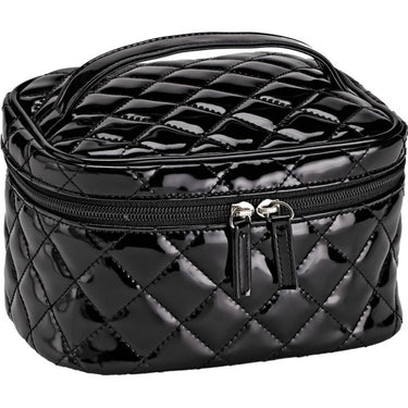 Quilted Medium Cosmetic Bag - Black / Case of 12. Carry all of your essentials in this elegant, fully lined medium cosmetic train case with zipper closure from The Quilted Collection. The black polyurethane material is stitched with a luxurious quilted pattern and has a top handle for added portability. This train case also has a small inside elastic pocket for added convenience. Ideal to be sold at retail or offered as a gift with purchase. Proposition 65 compliant.