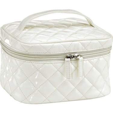 Quilted Medium Cosmetic Bag - White / Case of 12. Carry all of your essentials in this elegant, fully lined medium cosmetic train case with zipper closure from The Quilted Collection. The White polyurethane material is stitched with a luxurious quilted pattern and has a top handle for added portability. This train case also has a small inside elastic pocket for added convenience. Ideal to be sold at retail or offered as a gift with purchase. Proposition 65 compliant.