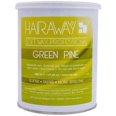 Resiné By HAIRAWAY® Green Pine Resin Wax / Strip Wax - Soft Wax / 27 oz. - 800 mL. Resiné By HAIRAWAY® Green Pine Resin Wax / 27 oz. A strong natural stabilized wax which gets the bulb of the hair upon removal while pine turbins desensitize the skin reducing redness and discomfort. The wax can be applied transparently thin onto both legs before removing with a strip and does not change consistency or crystallize. Great for speed waxing.
