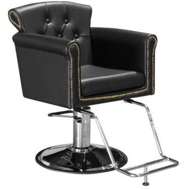 Rigmora Styling Chair. The Rigmora Styling Chair has an upscale look with leatherette cushioned upholstered back and seat. The Rigmora featues open black vinyl arms to help keep clients comfortable. The European styled "extended U-shaped" chrome footrest and it's space-saving, durable chrome hydraulic base are durbale and sleek yet very easy to keep clean.