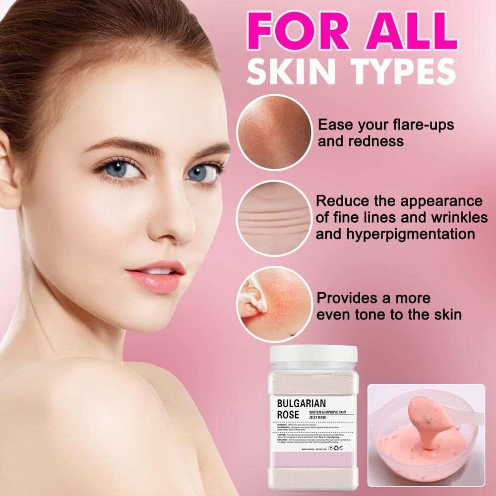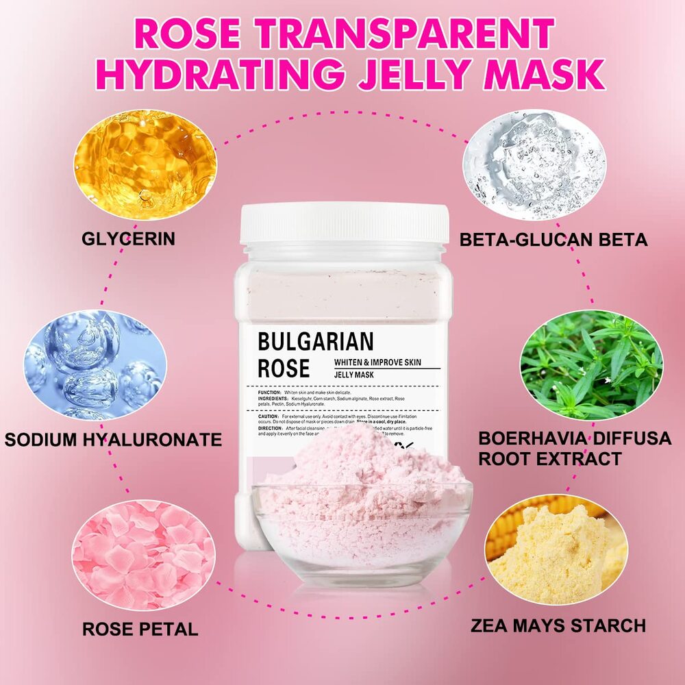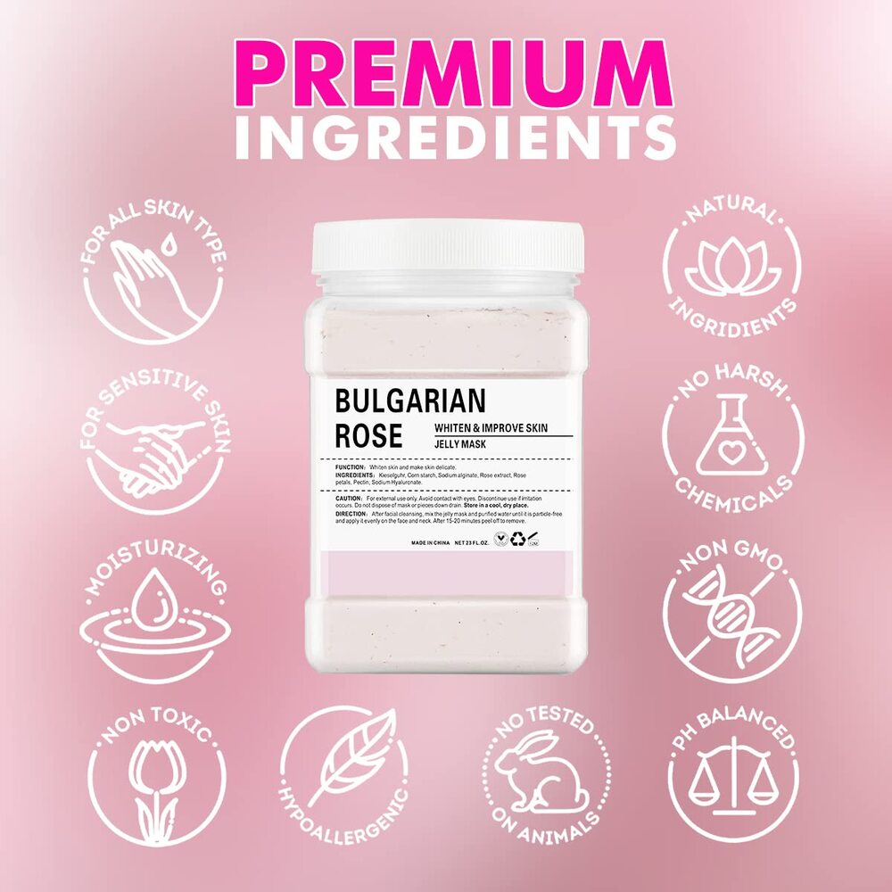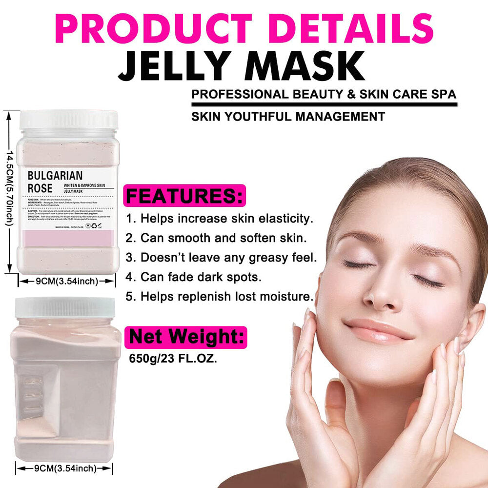 RoseRadiance Natural Rose Petal Jelly Mask / 23 oz. - 650 grams. Welcome to a world of luxury with the RoseRadiance Natural Petal Jelly Mask. Infused with the essence of Bulgarian roses, this exquisite mask is designed for professional use in spas and salons, offering a unique skin-whitening and improving experience.