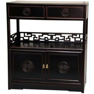 Rosewood Long Life Display Shelf Cabinet - Antique Black Finish. An elegantly compact Far Eastern design accent cabinet; at only ten inches deep, it takes up very little floor space wherever it''s placed. A beautiful, elaborately carved cabinet, crafted from exceptionally fine, kiln dried, distressed black lacquered Rosewood, with hand carved geometric "key" design shelf rails, and carved "Shou" symbol medallions and drawer pulls. This is a traditional oriental tea cabinet, built in similar configurations for hundreds of years with overhead drawers for tea, a lower cabinet for teapots and cups, and a center shelf to prepare the tea. Great looking in practically any room, home, or office, with a great combination of drawer, shelf and cabinet space.