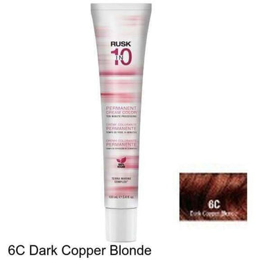 Rusk In 10 Permanent Cream Color - 6C Dark Copper Blonde / 3.4 oz. Rusk IN10 - TEN MINUTE Permanent Cream Color with Terra Marine Complex™. A unique blend of botanical and marine sourced oils and amino acids to deliver superior condition to hair.