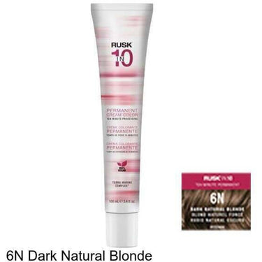 Rusk In 10 Permanent Cream Color - 6N Dark Natural Blonde / 3.4 oz. Rusk IN10 - TEN MINUTE Permanent Cream Color with Terra Marine Complex™. A unique blend of botanical and marine sourced oils and amino acids to deliver superior condition to hair.