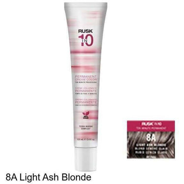 Rusk In 10 Permanent Cream Color - 8A Light Ash Blonde / 3.4 oz. Rusk IN10 - TEN MINUTE Permanent Cream Color with Terra Marine Complex™. A unique blend of botanical and marine sourced oils and amino acids to deliver superior condition to hair.