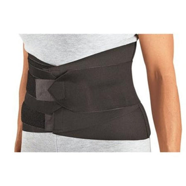 Sacro-Lumbar Support with Compression Straps / Large. Low profile 9" elastic support with double side pull compression straps. No stays. Ideal for providing support and compression for strains and sprains of the low back and abdominal area. Measurements taken from male waist and female hips.
