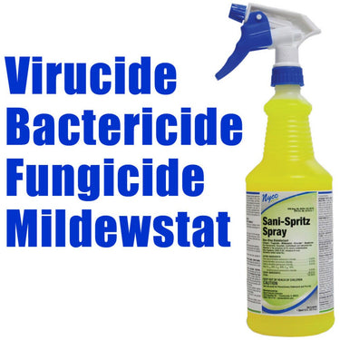 Sani-Spritz Spray - Ready to Use Lemon Scent Surface Disinfectant Deodorizer / Virucide + Bactericide + Fungicide + Mildewstat / 32 oz. with Trigger Sprayer. Sani-Spritz Spray is a one-step disinfectant cleaner that is effective against a broad spectrum of bacteria, is virucidal* (including HIV-1, the AID Virus and Hepatitis B Virus and Hepatitis C Virus), fungicidal, and inhibits the growth of mold and mildew, and their odors, when used as directed. Sani-Spritz Spray has been formulated to aid in the reduction of cross-contamination not only in hospitals, but in schools, institutions, and industries. It meets AOAC testing standards for hospital disinfectants. Use this RTU disinfectant on washable hard, nonporous surfaces of countertops, glazed tiles, stovetops, sinks, and toilet bowl surfaces.