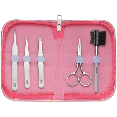 Satin Edge 5 Piece Eyebrow Set. Transform your client's look with the Satin Edge 5 Piece Eyebrow Set. This deluxe pink case includes everything you need to create perfectly groomed eyebrows. The Needle Nose Tweezer allows for precise hair removal, while the Pointed Tweezer is perfect for removing ingrown hairs. The Slant tip Tweezer is great for shaping and the Eyebrow Scissor can be used to trim stray hairs. The Eyebrow Brush/Comb helps to blend and tame unruly brows.