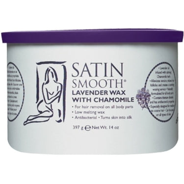 Satin Smooth Lavender Wax With Chamomile / 14 oz. Experience the ultimate in soothing waxing services with Satin Smooth Lavender Wax with Chamomile. Infused with the natural calming properties of lavender and chamomile, this premium wax is designed to alleviate tension and relax hair follicles, making for a more comfortable and enjoyable experience for your clients. Suitable for all skin types and formulated with titanium dioxide to eliminate the need for talcum powder, this wax is perfect for removing medium to coarse hair from any area of the body. The natural benefits of propolis ensure a safe and effective waxing service, leaving your clients feeling silky smooth and hair-free.