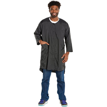 Scalpmaster Nylon Crinkle Uniform, Black. Achieve effortless style and comfort with the Scalpmaster Nylon Crinkle Uniform in Black. Made with 100% lightweight nylon, this uniform is perfect for busy professionals who need to move around with ease while looking their best. The full length design features two pockets and long sleeves, providing ample space to carry essential tools and accessories. With a snap front closure, getting ready for work has never been easier. This uniform fits up to size 14, making it an excellent choice for a range of body types. Elevate your professional image and feel confident in the Scalpmaster Nylon Crinkle Uniform.