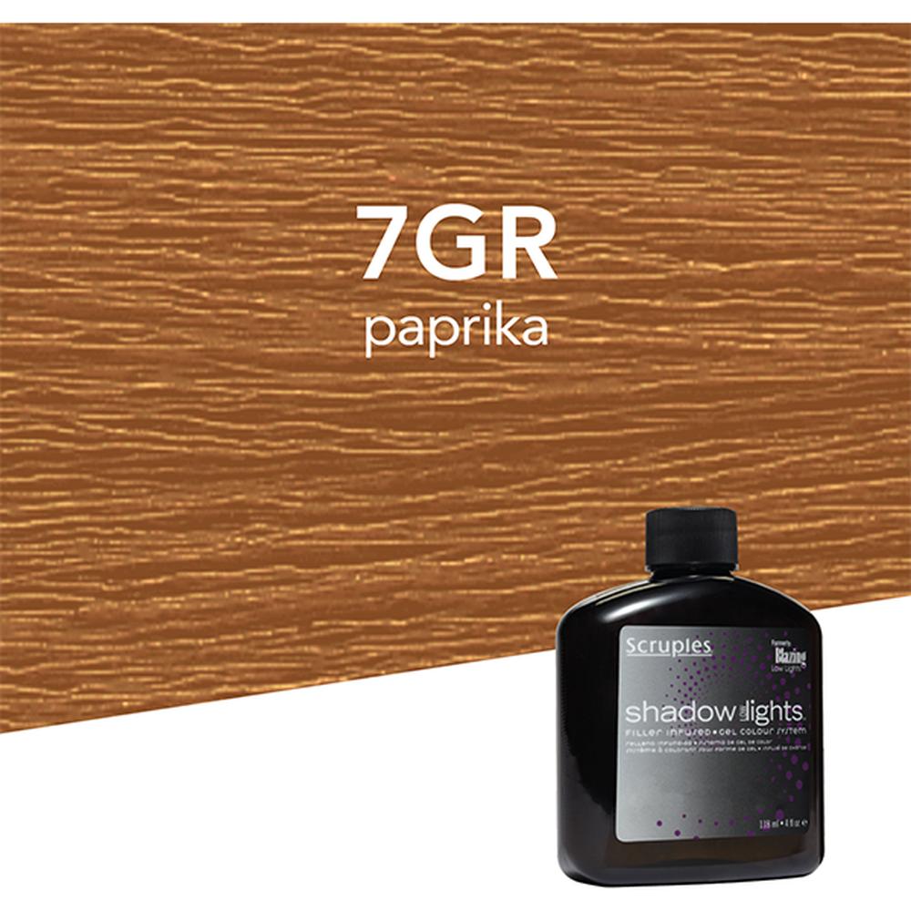 Scruples Shadow Lowlights Filler Infused Gel Color - 7GR Paprika. The Scruples Shadow Lowlights Filler Infused Gel Color in 7GR Paprika brings a vibrant, warm pop of color to your clients’ hair while maintaining the healthy, conditioned feel they desire. Designed with professionals in mind, this filler-infused gel color simplifies the lowlighting process by combining color and filler into one easy step. The 7GR Paprika shade adds fiery red tones that create eye-catching dimension, perfect for clients looking for a bold yet sophisticated lowlight effect.