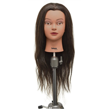 Selena 100% Human Hair Manikin - 28"-30" Dark Brown Hair. 100% human hair manikin features 28"-30" of medium brown hair, a natural neck and facial make-up.
