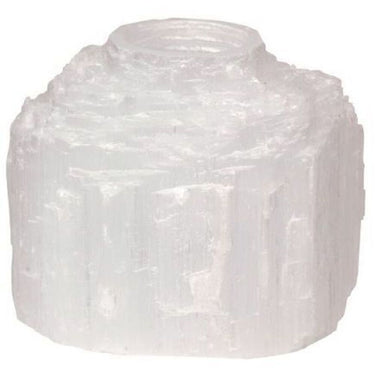 The Selenite Natural Candleholder stands at a height of 3.5 inches and features a diameter of 3-3.5 inches, making it a versatile and easily placed addition to any table or shelf. Its lightweight construction, weighing between 1-1.5 lbs, ensures that it can be moved and positioned with ease. The unique crystalline structure and pearlescent finish make each piece truly one of a kind.