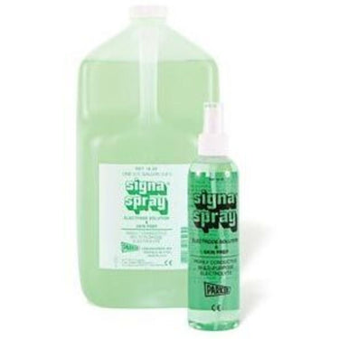 Signa Spray Gallon with Empty 8.5 oz. Bottle. This economical, highly conductive bacteriostatic electrolyte and skin prep is ideal for use with muscle stimulation equipment when a non-gritty formulation is indicated. Signaspray is non-staining and easy to apply. And, because it is non-gritty and there is no residue build-up, Signaspray is easy to clean up. Signaspray is not recommended for defibrillation procedures. Highly conductive multi-purpose spray electrolyte for skin prep, ECG, muscle stimulation, etc. Bacteriostatic, hypoallergenic, non-staining. No residue build-up, easy to apply, easy to clean-up. Available in 8.5 oz or 1 gallon.