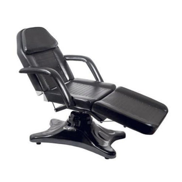 Skylar Hydraulic Facial Bed / Black. This nicely designed facial bed features comfortable thick foam foot, seat and back rest cushions. The cushions are upholstered with an easy-to-keep-clean and comfortable white PVC vinyl material for years of durability. The bed features a face cut-out pillow and fully removable armrests (without screws or nuts). With adjustable head, back and leg rests, the back of the chair is adjustable upward for customer comfort, and the footrest is adjustable downward. Features also include a heavy duty metal base and hydraulic pump, and the bed swivels 360 degrees. This is truly a very versatile facial table and is ideal for facials, skin care, massage, tattooing, or body piercing.