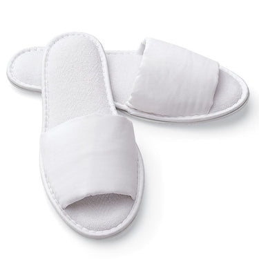 Slippers - Open Toe - Microfiber / Woman's / White. Spa slippers are ideal for keeping your feet warm and dry while navigating the bathroom or the rest of the house. The special non-skid soles were perfected by years of spa experience. Every time you nestle your feet into the cushy foam lining you'll feel the difference.