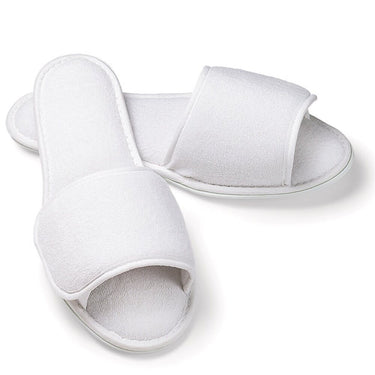 Slippers - Open Toe with Velcro Closure - Terry / Woman's / White. Spa slippers are ideal for keeping your feet warm and dry while navigating the bathroom or the rest of the house. The special non-skid soles were perfected by years of spa experience. Every time you nestle your feet into the cushy foam lining you'll feel the difference.
