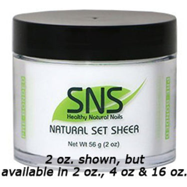 SNS Natural Set Sheer Dipping Powder - Pre-Bonded / 4 oz. by SNS. Natural Set Sheer - Pre-Bonded. The perfect finish for the perfect nail. Designed to overlay the French Manicure or Gelous Glitter to bring out the shine and create a strong nail, healthy nail. (Organically Processed Chemicals)